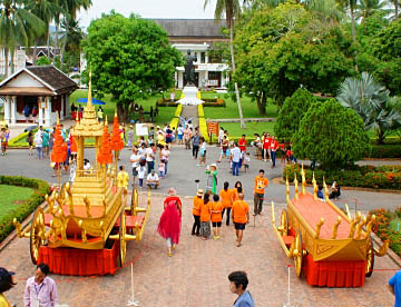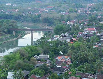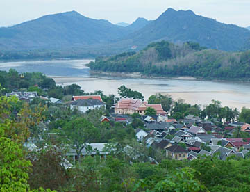 この街は他のアジアの街と異なり車やツゥクツゥクやバイクの騒音も排気ガスも少なく、フランス領だった名残の建物と多くの寺院が溶け込み静かで落ちついた古都です。街の中心にあるプーシーの丘には、ルアンパバーン寺院、シェントーン寺院など多くの仏教寺院があり、丘の上からは情緒あふれるルアンパバーンの街並みが見渡せる。