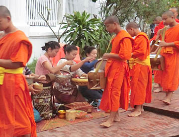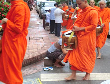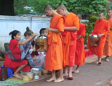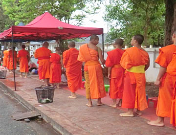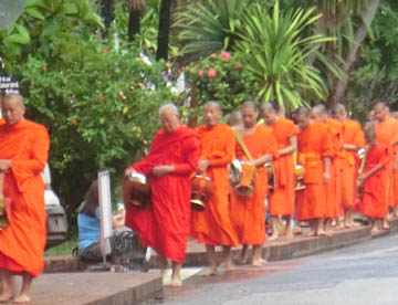 ルアンパバーン中にあるお寺から、小さな少年僧から年配の僧侶まで、オレンジ色の袈裟を纏って大きな入れ物を持って、ぞろぞろと出てきます。