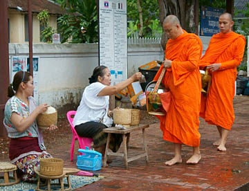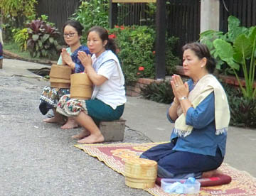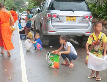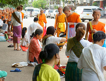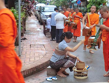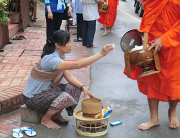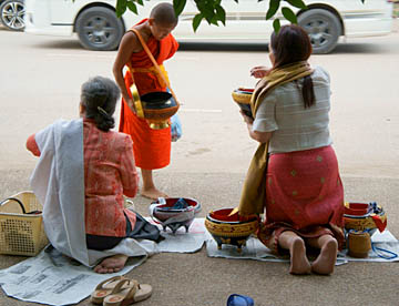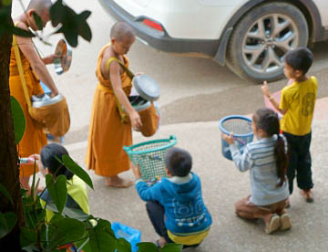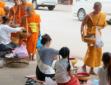 人々は通りに敷物を敷き、それぞれが持ち寄ったご飯をお坊さんの入れ物に入れていきます。少年僧にはお菓子も入れています。