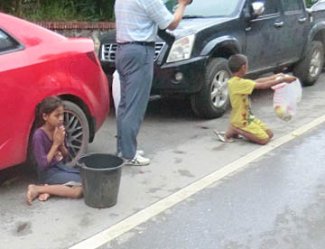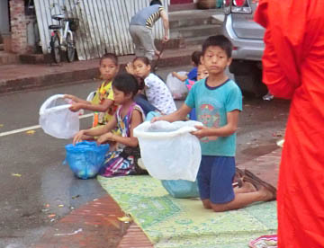 面白いのは托鉢をする人の後方にカゴを地面に置いたり、袋を広げて待つ子供の姿。