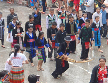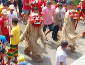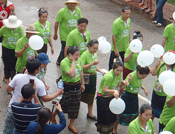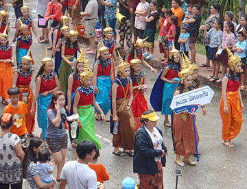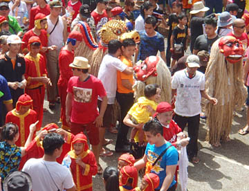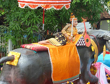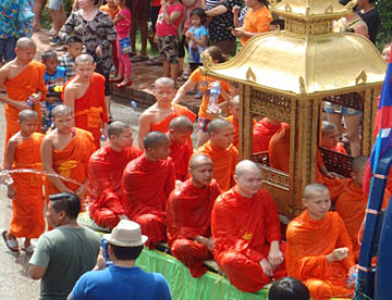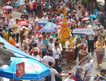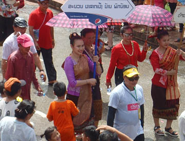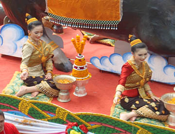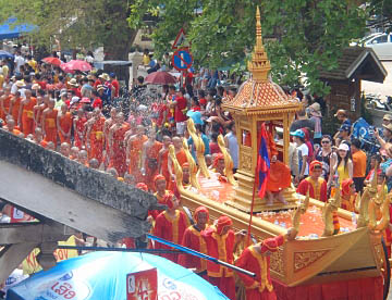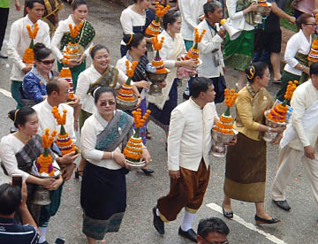 そして、ピーマイラオの目玉と言えば、目抜き通りで行われるパレードです。旧王都ルアンパバーンのピーマイラオは特に盛大で、お坊さんの他に、コンテストで選ばれた美女7人が、神様の首を手に聖なる動物に乗って街中をパレードします。先頭を切って歩いてきたのは、ラオスの神様プーニューとニャーニュー。表情はあどけなく、とっても可愛い。パレードは素朴なラオスらしく少数民族や老若男女の地元の人々でにぎわいます。まさにめでたいお正月気分でした。
