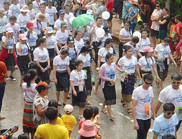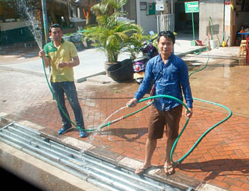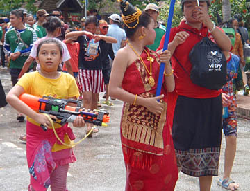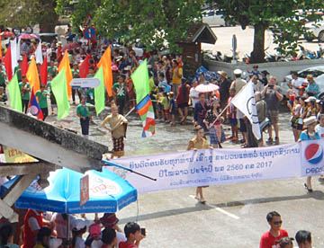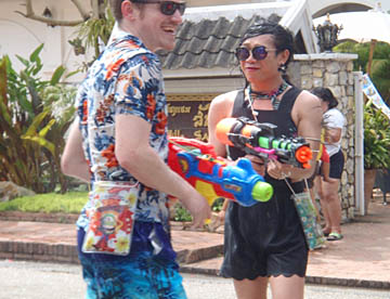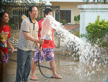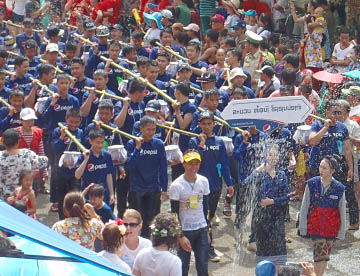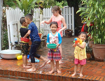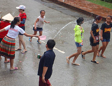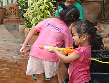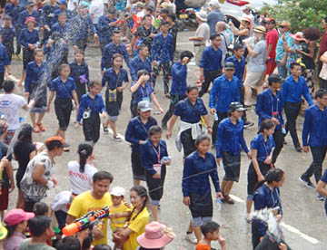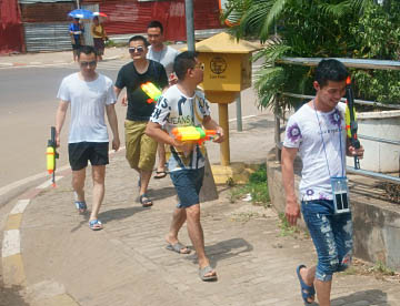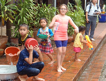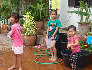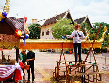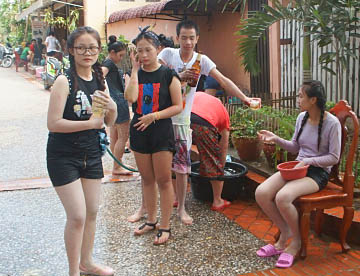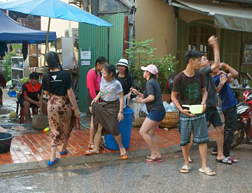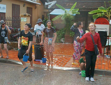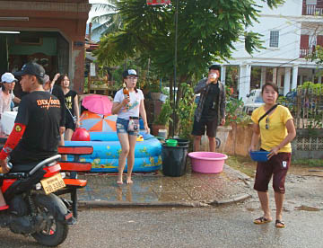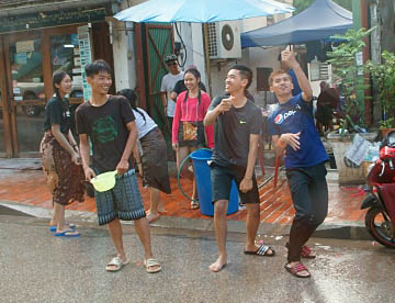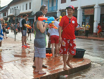 国内外から観光客が押し寄せ、とっても賑やかで華やかな雰囲気です。ピーマイラオでの名物はみずかけ。期間中人々は路上でバケツや水鉄砲を持って、地元の人、観光客などそんなことは関係なく水をバシャバシャかけ合います。この時期の、ラオスは乾期の終わりとあって、雨は殆んど降らず毎日が暑いのでバケツの水をジャーとかぶっても気持ちいいほどです。また日差しが強いのですぐに乾きます。水をかけることで、旧年中の悪いものを洗いながし、すがすがしく新年を迎えるという意味があるそうです。