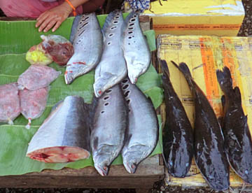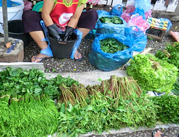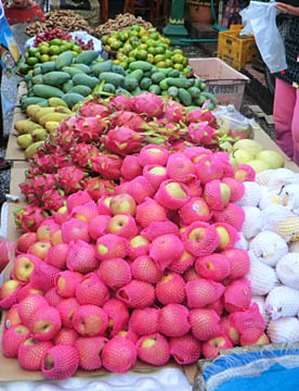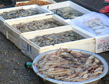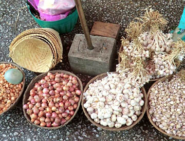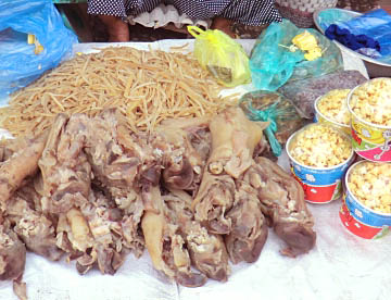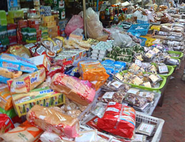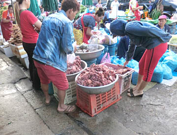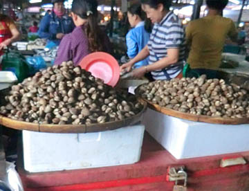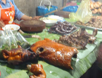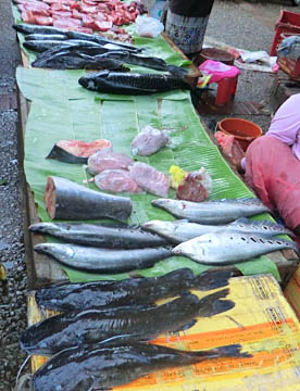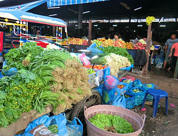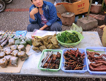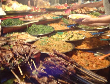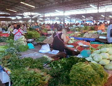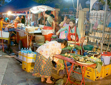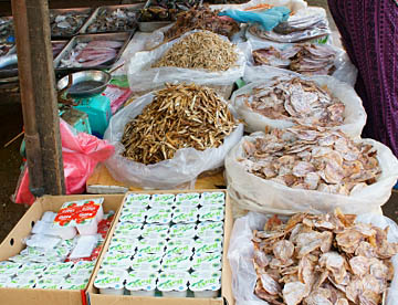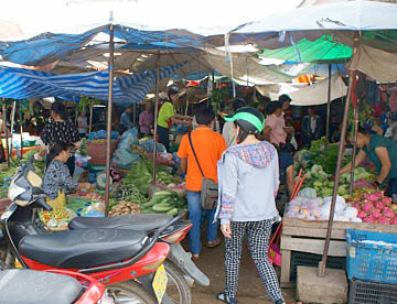 ルアンパバーンのタラートプーシー市場に行ってみましたが、広い市場には所狭しとお店がならび、すべての台の上には豊富な食材が積み上げられ大勢の市民の人がそれらを求めていました。生肉や魚類も常温のまま平積みされて売られていたのには驚きましたが、とても活気に溢れた市場でした。
