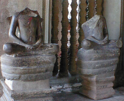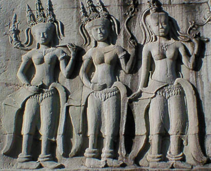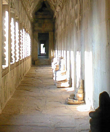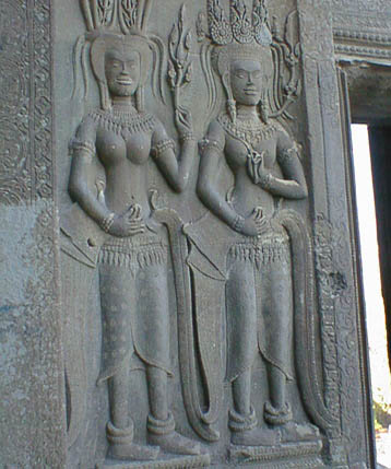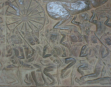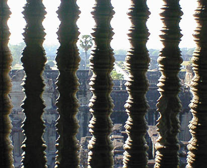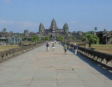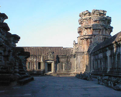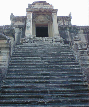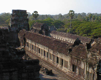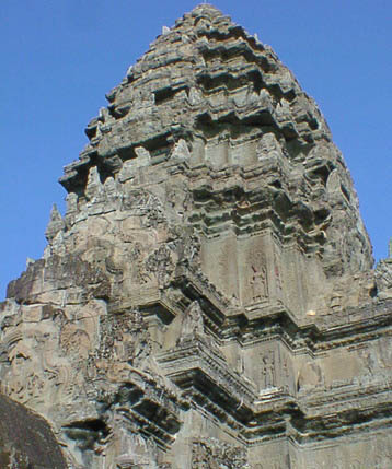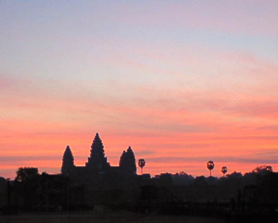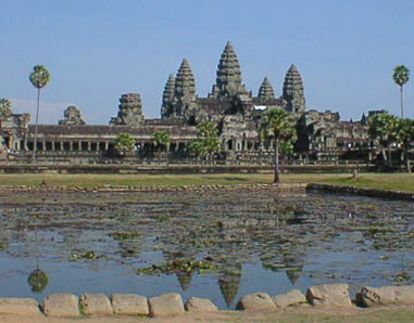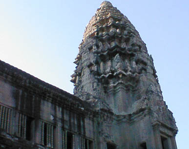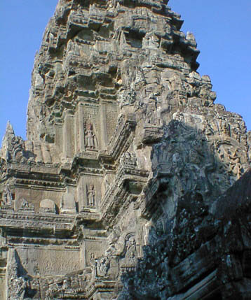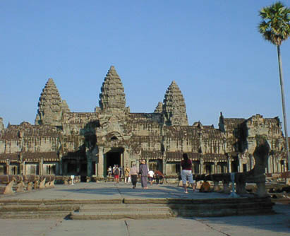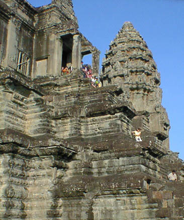 | アンコールワット 文字通りアンコール遺跡観光の中心となる遺跡。 そのスケールの大きさと繊細なレリーフの見事さは急勾配の石段をはいつくばって登ってみる価値 大。 上から見る周囲の景色も美しい。 朝焼けのアンコールワット鑑賞は薄雲がかかっていたので、期待していたほどではなかった。 |
