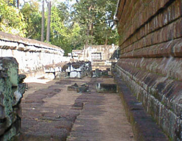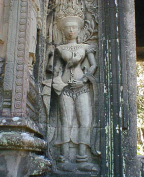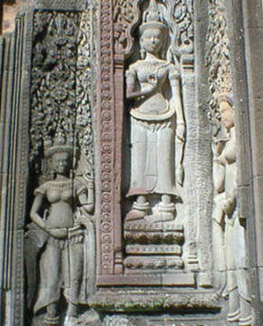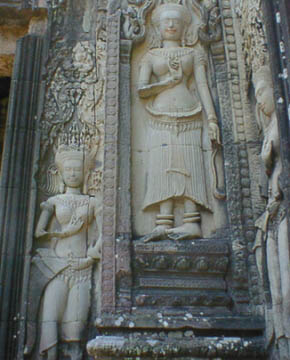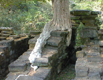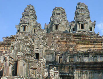 タケウ タケウの遺跡は当時の王が造営途上に死去したために、石をあたかもピラッミドを造るかのように積み上げた状態で放棄された寺院です。 彫刻等は殆どなく、それがかえって男性的な威圧的とも思える感じで聳えています。 アンコールワット建設のお手本とされたと言うのもうなずけます。 急な石段をお年寄りの方々と緋色の袈裟を纏った僧侶の一団と一緒に、はいつくばるようにして中央塔の一番上まで登ると、そこには石仏が安置されていて、やがて読経が始まりました。 今でも信仰の対象にされていて、人々のあげるお線香の煙が絶えることはないようです。 |