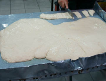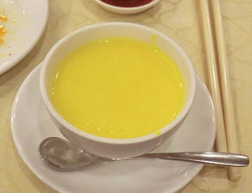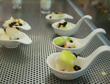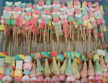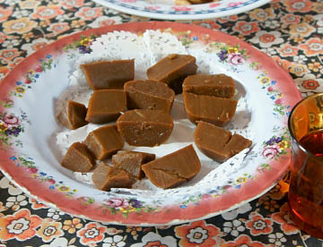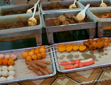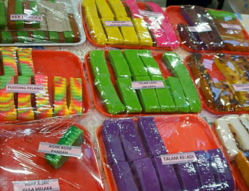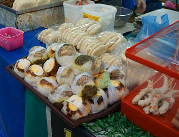 サゴヤシの樹液で出来た日本の「ういろう」に似た食感でそのものの味は殆んど無く何種類か用意されているタレに付けて食べる。