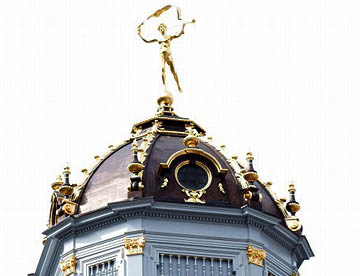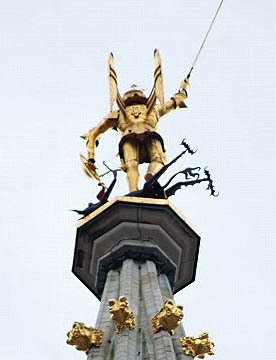 その広場を囲む最大の建物が頂きに守護天使ミカエルの像を輝く高さ96mの尖塔が真ん中に聳える市庁舎。