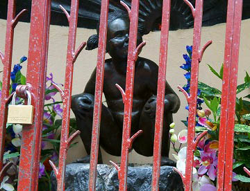近くには小便少女の像があり、何故だか真っ赤な鉄格子には鍵が。