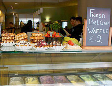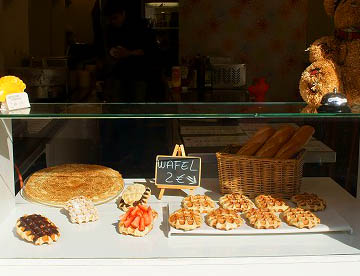 名物の「ベルギーワッフル」は見慣れた円形のものも有りましたが、街中で食べられているのは弁当箱ほどの大きさで物凄く甘そうなトッピング。