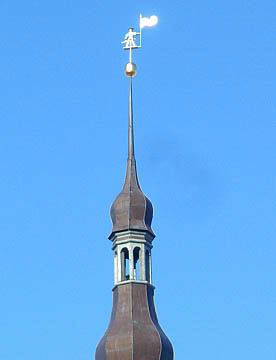 「上の街」と「下の街」を隔てる門をくぐって旧市庁舎前へ。旧市庁舎の塔の先端にはこの街を見守る「トーマスおじさん」が。