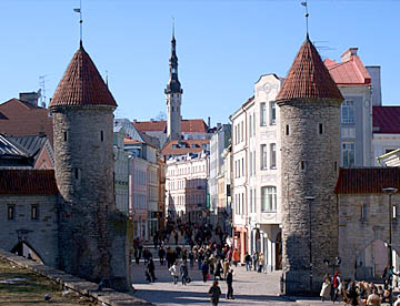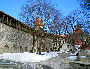 『歌の原」からタリンの港に戻って一面に流氷で覆われたタリン港を間近に見てからバスで旧市街を取り囲む城壁に沿ってぐるっと一周。