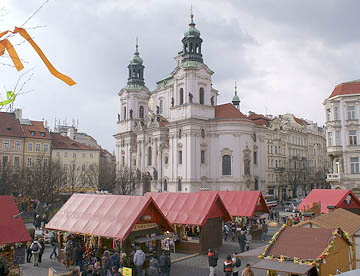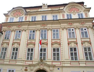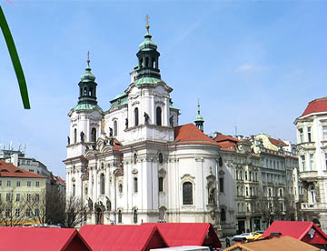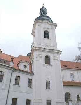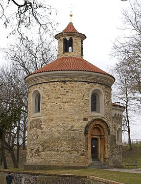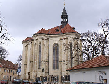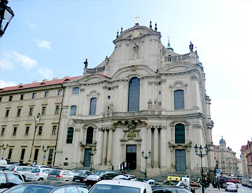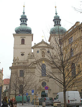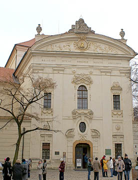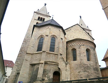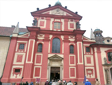 聖・イジー教会の外観は聖ビート大聖堂のゴシック様式の高い尖塔とは対照的なロマネスク様式の白い尖塔と赤味がかったバロック様式のファサードの華やかな感じがする。