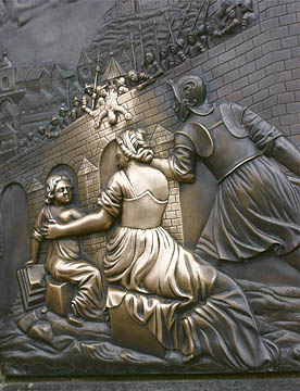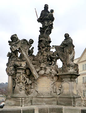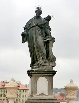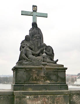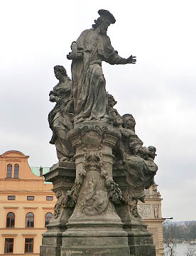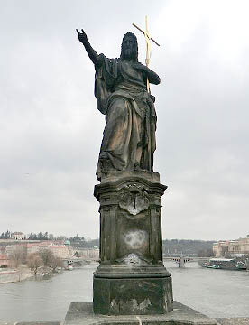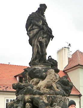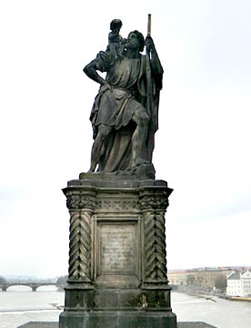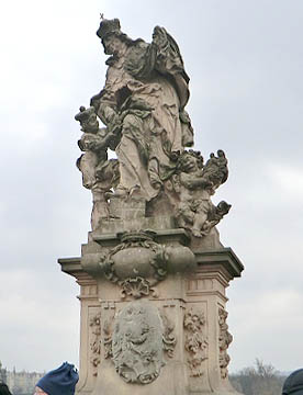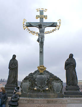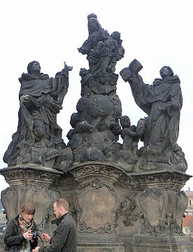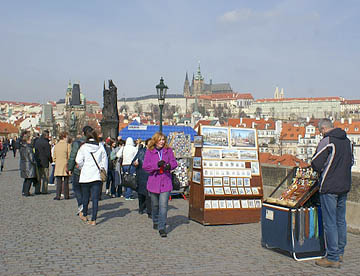 黒い大きく高い橋塔をくぐって渡る橋の欄干には30体の聖人像が。車の通行は完全に出来なくなっていて、橋の上は昼も夜も人で溢れかえっている。