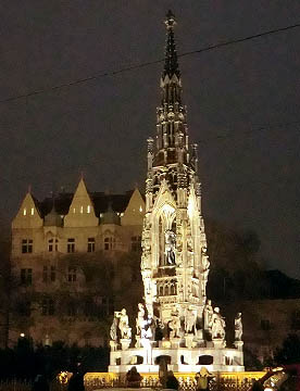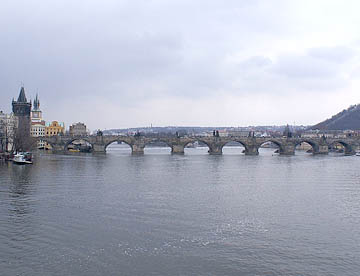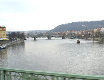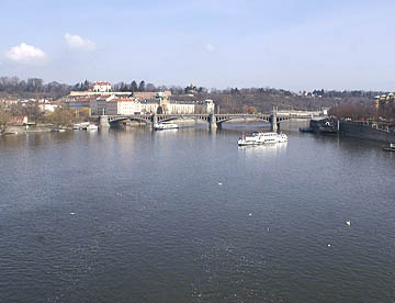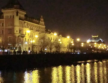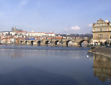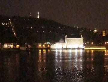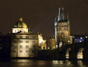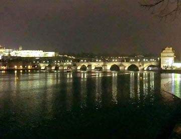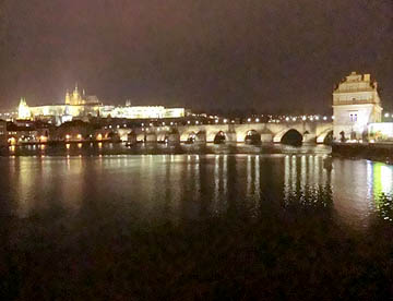 ホテルから国民劇場の前を通りヴルタヴァ川(モルダウ川)へ出て対岸に聳えるライトアップされたプラハ城を見ながらカルレ橋へ。