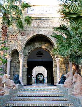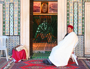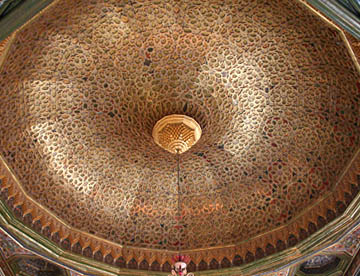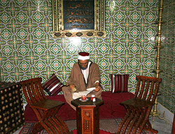 美しい透かし彫り、色鮮やかなタイル貼り。そんな回廊に面したモスクには今もアブ・ザマエル・ベラウィの遺体が安置されている。