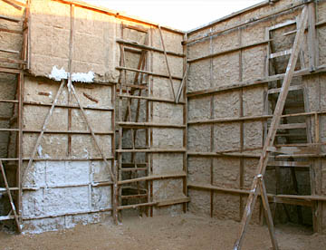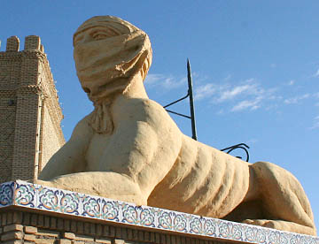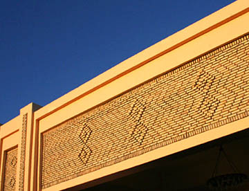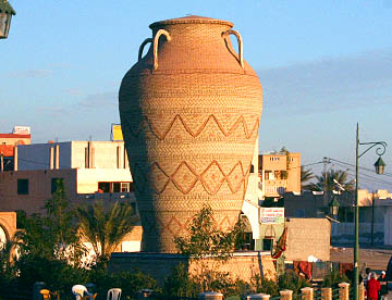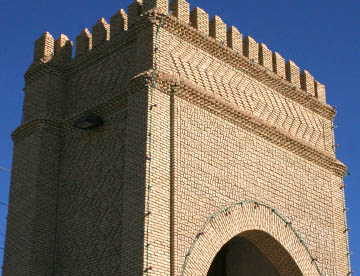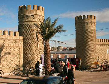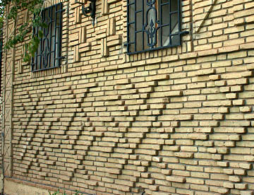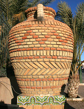 普通のレンガの半分の厚さの日干しレンガで、使われた土によって色が異なり、塀、門、外壁に装飾が施されていてその素晴らしいアートのセンスに驚かせる。道路のロータリーに置かれた大きな壷や街中の要所にあるゲートも日干しレンガの幾何学模様で飾られている。
