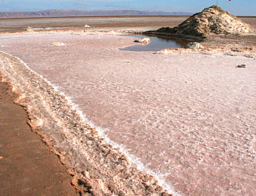 道路わきの水路のような水溜りの周囲と底は真っ白な塩の塊となっているが一部はピンク色をしている。