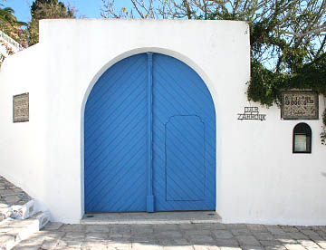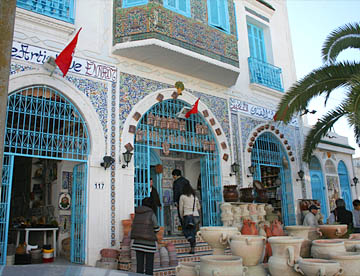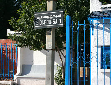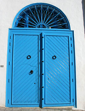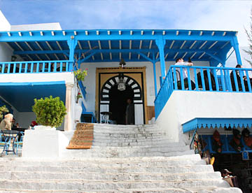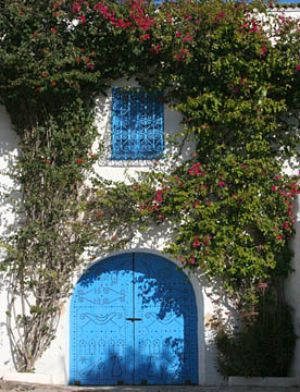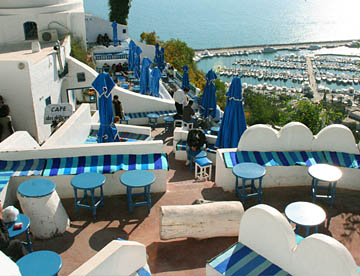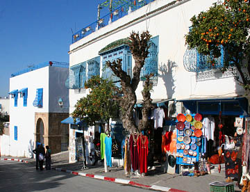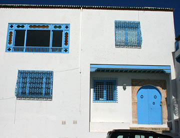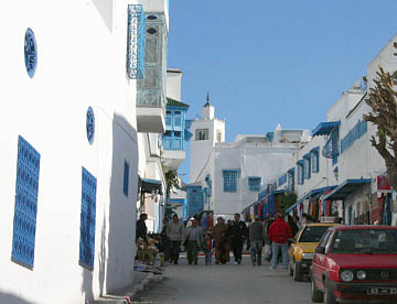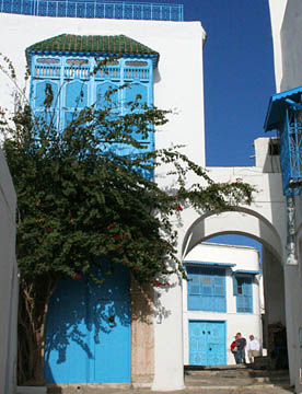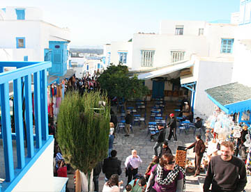 白い壁とチュニジアンブルーの扉、窓、手すりとのコントラストが美しい坂道の街だ。