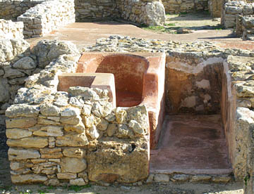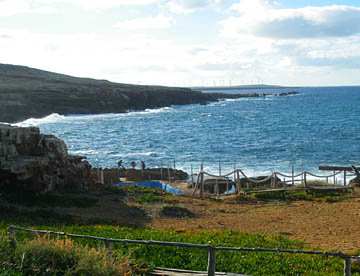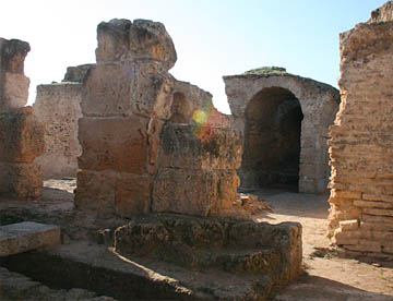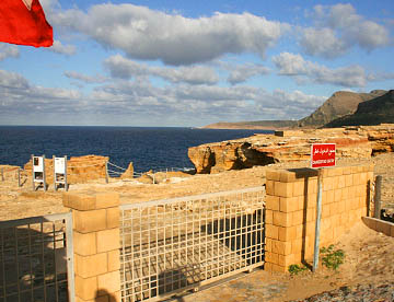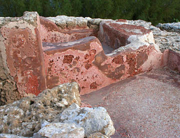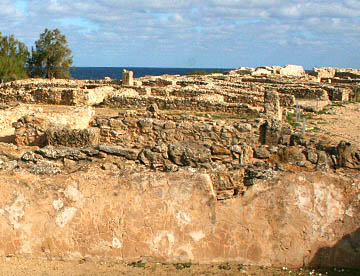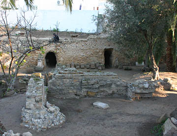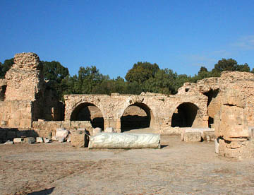 その次はアントニウスの共同浴場跡。地上部分はほとんど残っていないが、ブルーの地中海を背にして建つ共同浴場で残された石組みから往時の大きさがいかに大きかったが伺える。