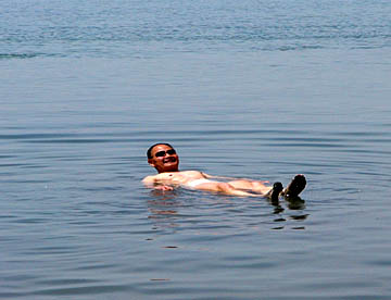 砂浜は赤い小石だったが、死海の中の足元は真っ黒な泥でぬるぬるとすべる。腰のあたりの深さまで歩き、腰を落とす・・・・ん、本当に浮かぶ。