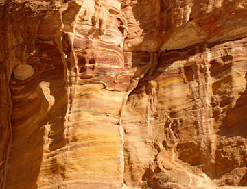 両側はほぼ直角に深く切り立った岩肌の峡谷を曲がりくねって、途中ちょっと広くなったり、狭くなったりとしながらの道だが、綺麗な模様の岩肌や彫刻等を見ながらで飽きることはなく、最後の狭く暗いシークに入ると岩の間からピンク色のエル・ハズネ(エル・カズネ)が姿を現す。
