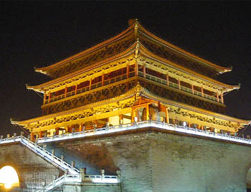 すぐにレストランに向かい夕食。食後はライトアップされた西安の街並みを観るオープントップバスでの観光。だが生憎の雨。
