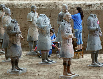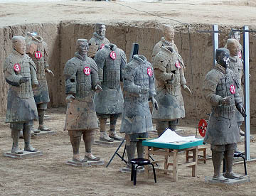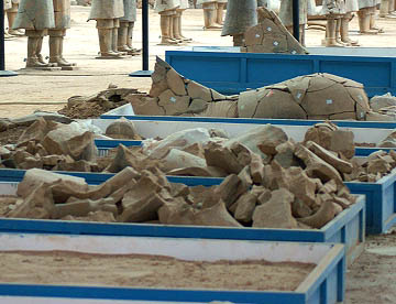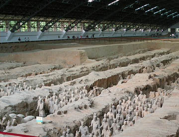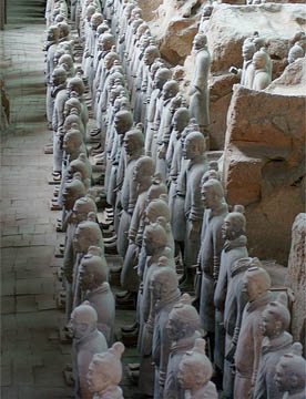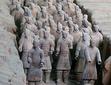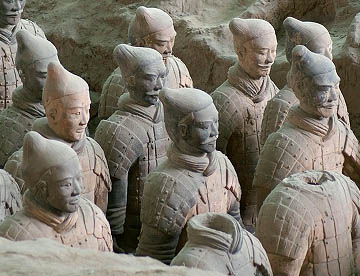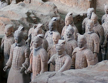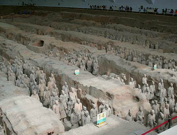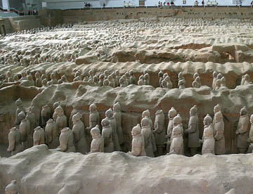 兵馬俑は始皇帝の陵墓を守るためのば陪葬物として造られた兵士、馬、馬車等の素焼きのような感じの陶製でほぼ等身大の大きさで造られている。