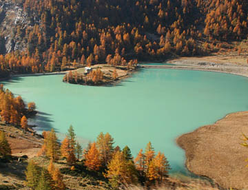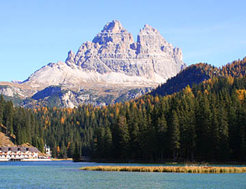 9時にホテルを出て針葉樹林の黄葉が綺麗な道をドロミテの真珠・ミズリーナ湖へ。