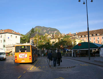 昼食後はバスに乗って高速道路(こちらは有料)からの周囲の山々、山あいの小さな集落などを眺めながら、ドロミテ街道の西側の玄関口・ボルツァーノへ。