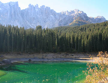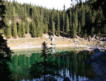 視界が開けて、針葉樹林帯に入るとカレッツァ湖はすぐだ。