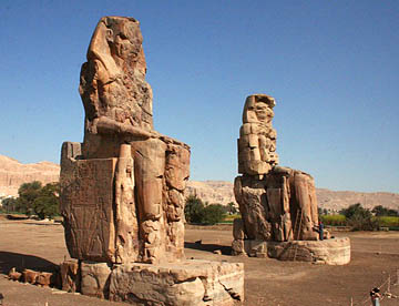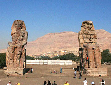 のどかな農村風景の中を昨日通って来た道を上流のエスナに向かい、橋を渡り『死者の街』に入ると今度は北上して王家の谷を目指す。やがてメムノンの巨像と呼ばれる2体の石造のアメンヘテプ3世の坐像が見えてくる。近づいて見上げると、かなり傷んでいるのがわかる。