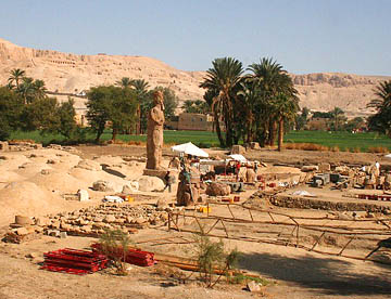 2体の坐像の後方一帯は現在発掘、修復作業が行われているが、アメンヘテプ3世の葬祭殿の大きな遺構が眺められる。