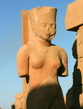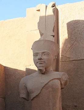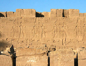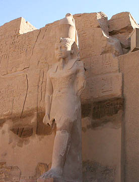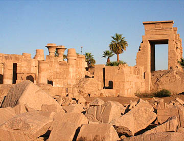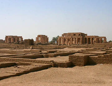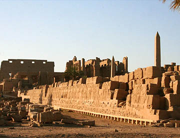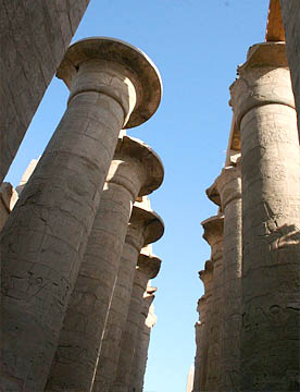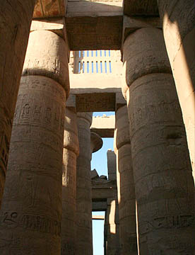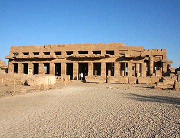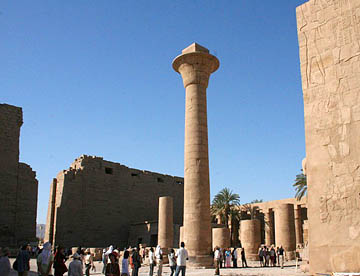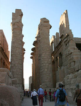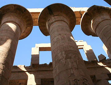 最大の神殿はアメン神殿で、ルクソール神殿同様の太く背の高い石柱が林立していて、一部には彩色された壁画も残っている。