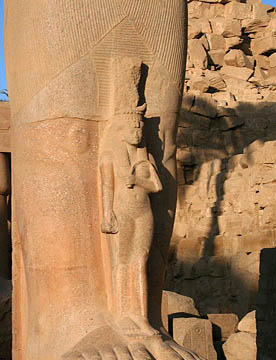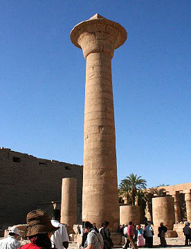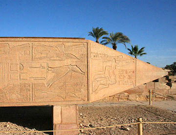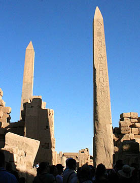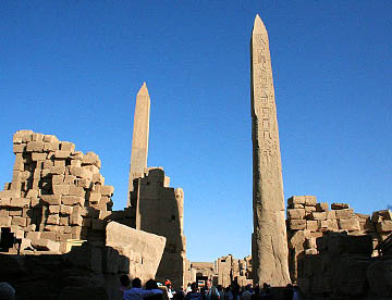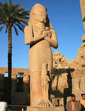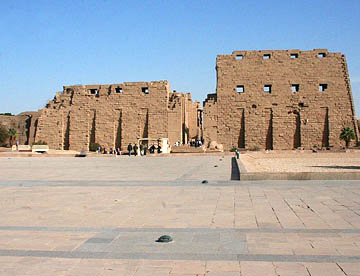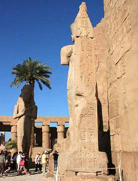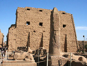 ラムセス2世の座像が両脇を固める堂々とした第一塔門は横幅65m高さ24m。そのすぐ前には高さが25mのオベリスク。
