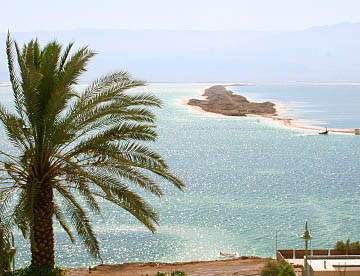 死海は南北に細長い湖で、現在ではヨルダンとの国境となっていて、対岸にはヨルダンの山並みが見える。
