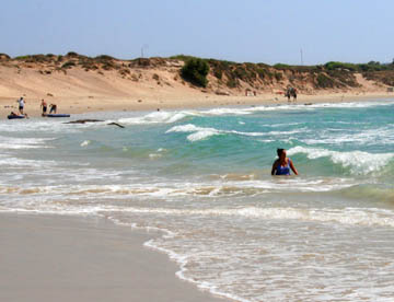 きれいな砂浜が広がっていて、朝から泳いでいる人もいる。