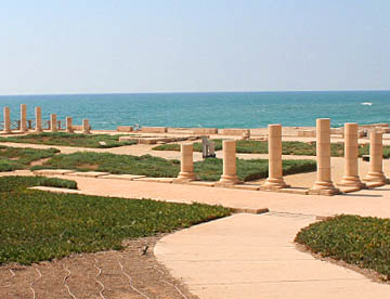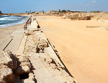 海岸の一段低い場所には「海岸神殿(ヘロデ王の宮殿)」の遺構が残されているが、海岸部分では沈下がすすんで波に洗われている。