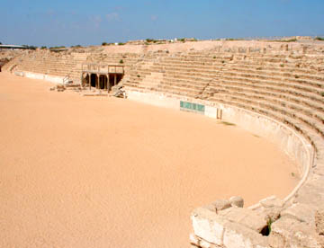 カエサリアでは最初にローマ時代の水道橋を見てから、今もコンサートやオペラなどに使われている円形劇場へ。この円形劇場は海側の舞台後部のつくりはなくなっているが舞台と観客席は完全に復元されていて、舞台下の控え室や通路はもとのままに残されている。