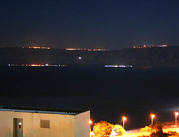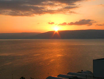 目を覚ますとガリラヤ湖の対岸、ゴラン高原の上空が茜色に染まって陽が昇るところだった。