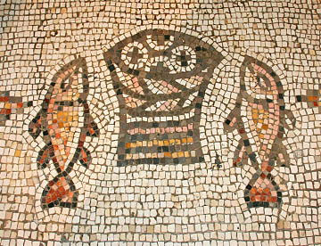 ほど近いタブハの「パンと魚の奇跡の教会」では祭壇の下に描かれたパンと魚のモザイクをみる。