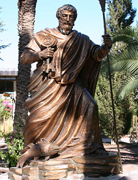 さらに、こじんまりとした「ペテロの招命教会」と教会前の植え込みの中のイエスとペテロの銅像を見てイエスの宣教活動が行われたとされる「シナゴーグ跡」と「聖ペテロの家教会」を見学。ここの入り口の聖ペテロの銅像は釣竿を持ち足元には魚が。