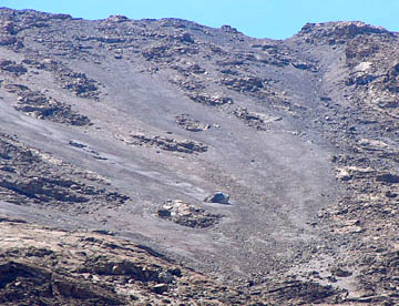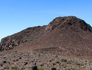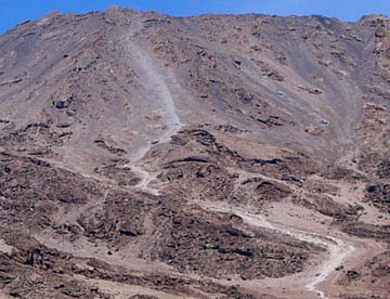 それに向かっての登山道が、一面が赤茶けた細かい石と砂で覆われた「サドル」の中に見られる。