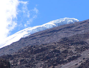 左手やや下に大きな雪の壁(これがキリマンジャロの雪!?)、その奥にマウエンジ峰、右手は青白い万年雪に埋めつくされた大きなクレイター。