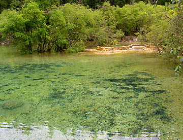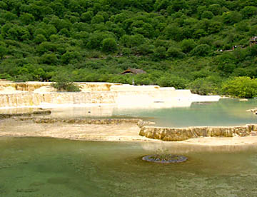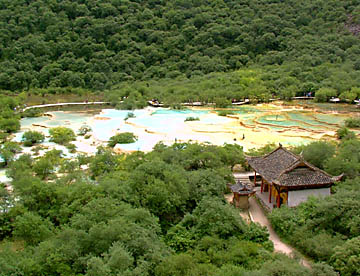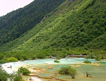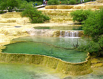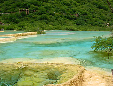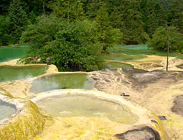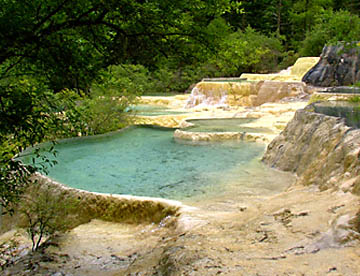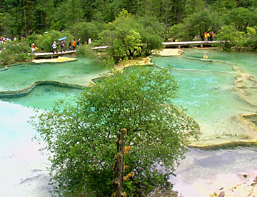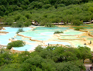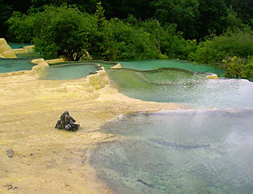 黄龍の観光のポイントは黄色の石灰岩で形作られた堤に堰き止められた水の色との対比の美しさにあると思う。