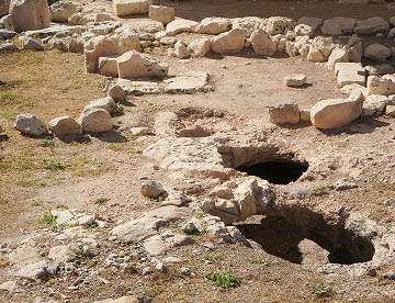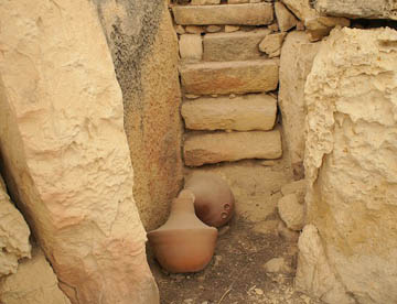 三門石造りの入り口前には生け贄の動物を繋ぐ穴があけられている。入り口を入ってすぐに半月状の部屋があり奥には祭壇、柱には無数のドット模様が見られる。