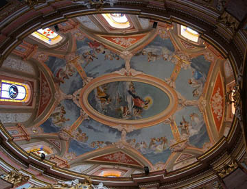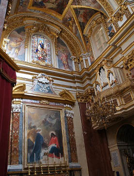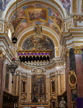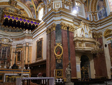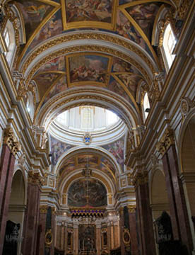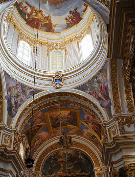 大聖堂は外観から見た感じよりも大きく、中央祭壇のほかに十字型に礼拝堂が配置され、聖パウロの難破を描いたフレスコ画をはじめ、天井や壁を埋め尽くす豪華な内装が印象的でした。