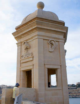 セングレア監視塔は多くの船が行き交うグランドハーバーをヴァッレッタ側とセングレア側とで挟むように監視できる場所に位置し、セングレア監視塔の左右には目と耳が彫られていて、敵の攻撃を海と空から目を凝らし、耳を澄ませて休むことなく監視していることを表しています。