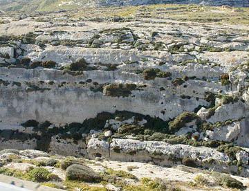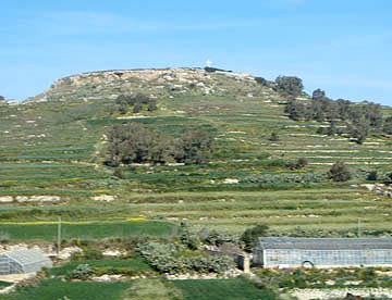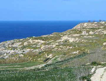 周囲に島のパノラマが広がり、開放的な感じがします。マルタ島のハジャーイム神殿やイムナイドラ神殿にはドーム状の帆布製の屋根が掛けられていて本当の色は分かりにくいのですが、このジュガンティーヤ神殿には屋根もなく青空の下で巨石の本当の色がわかります。"
