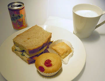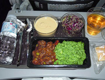 離陸後1時間ほどで夕食。焼き魚のクリーミーレモンソース掛けをチョイス。眠かったので味はあまり記憶にないがデザートのダブルチョコムースが美味しかった。