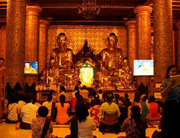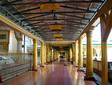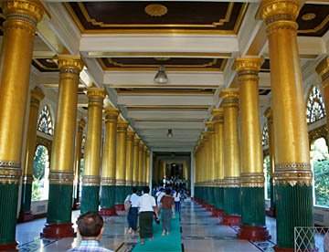 シュエダゴン・パゴダは本殿に着くまでに長いエスカレーターがあり、裸足で乗り基壇の上にあがります。